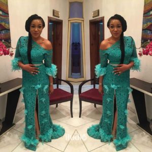 @biodunapoola wearing a green sleeveless mermaid dress with silver side peplum