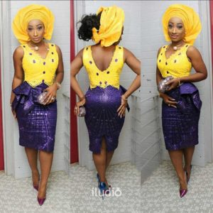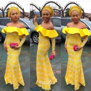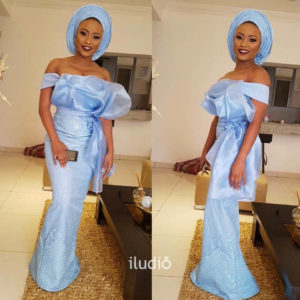Toke Makinwa in green sweetheart dress with a drooping sleeve. She also is wearing a green rose gele.