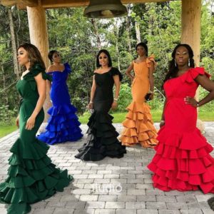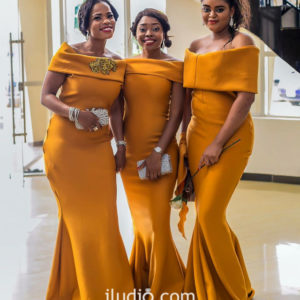 Gold top and red bottom bridesmaid dresses. The bride wears an all gold reception dress.