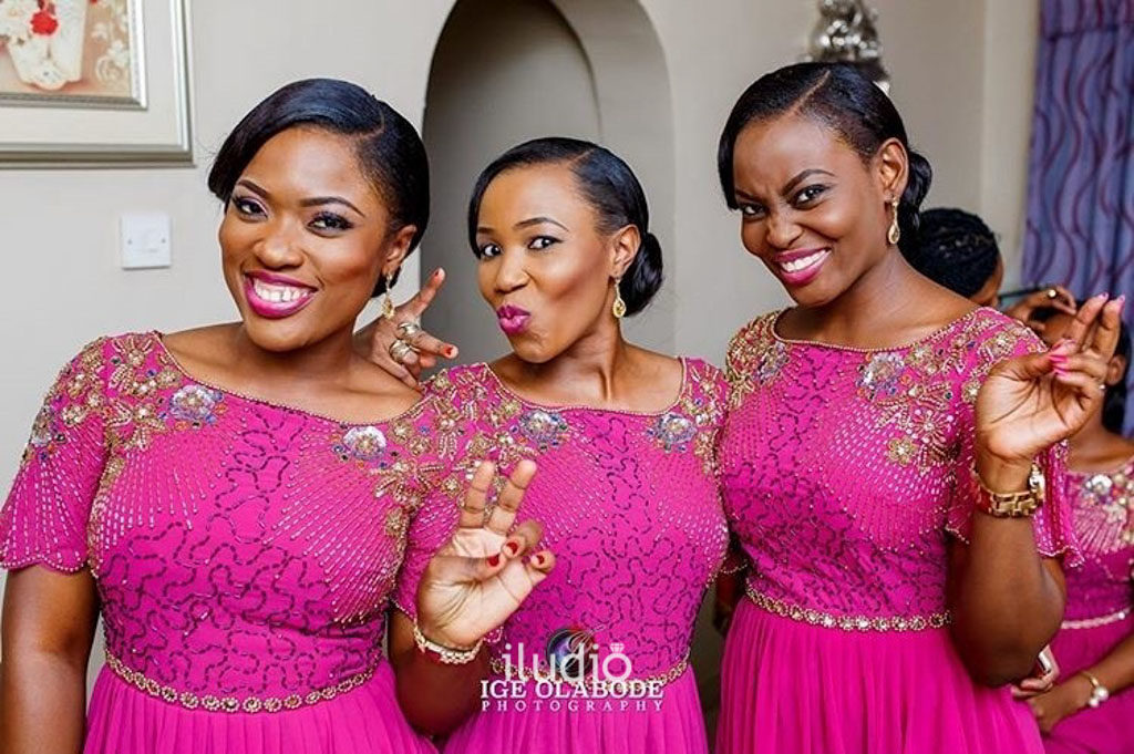 Pink One-Shoulder Bridesmaid Dresses With Cape. The maid of honor wears a different shade of pink with illusion neckline.