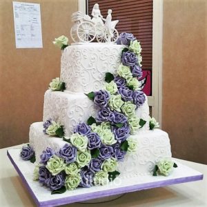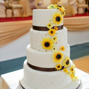 4-tier cylindrical wedding cake with flowery patterns and silver bow ribbon