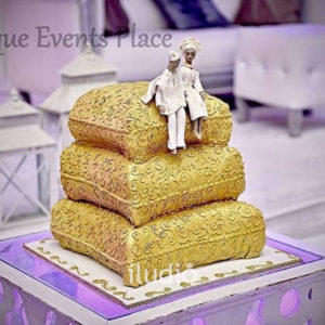 A pink cake with kolanuts sprinkled on and around the cake. A decorated palm wine gourd on top of the cake.
