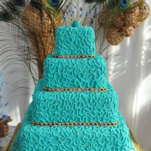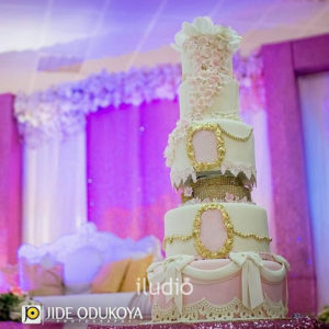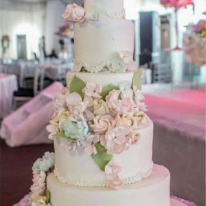 Gorgeous Ombre Cake with various shades of pink. Behind the cake is a heart shade floral decoration with similar colours as the cake.